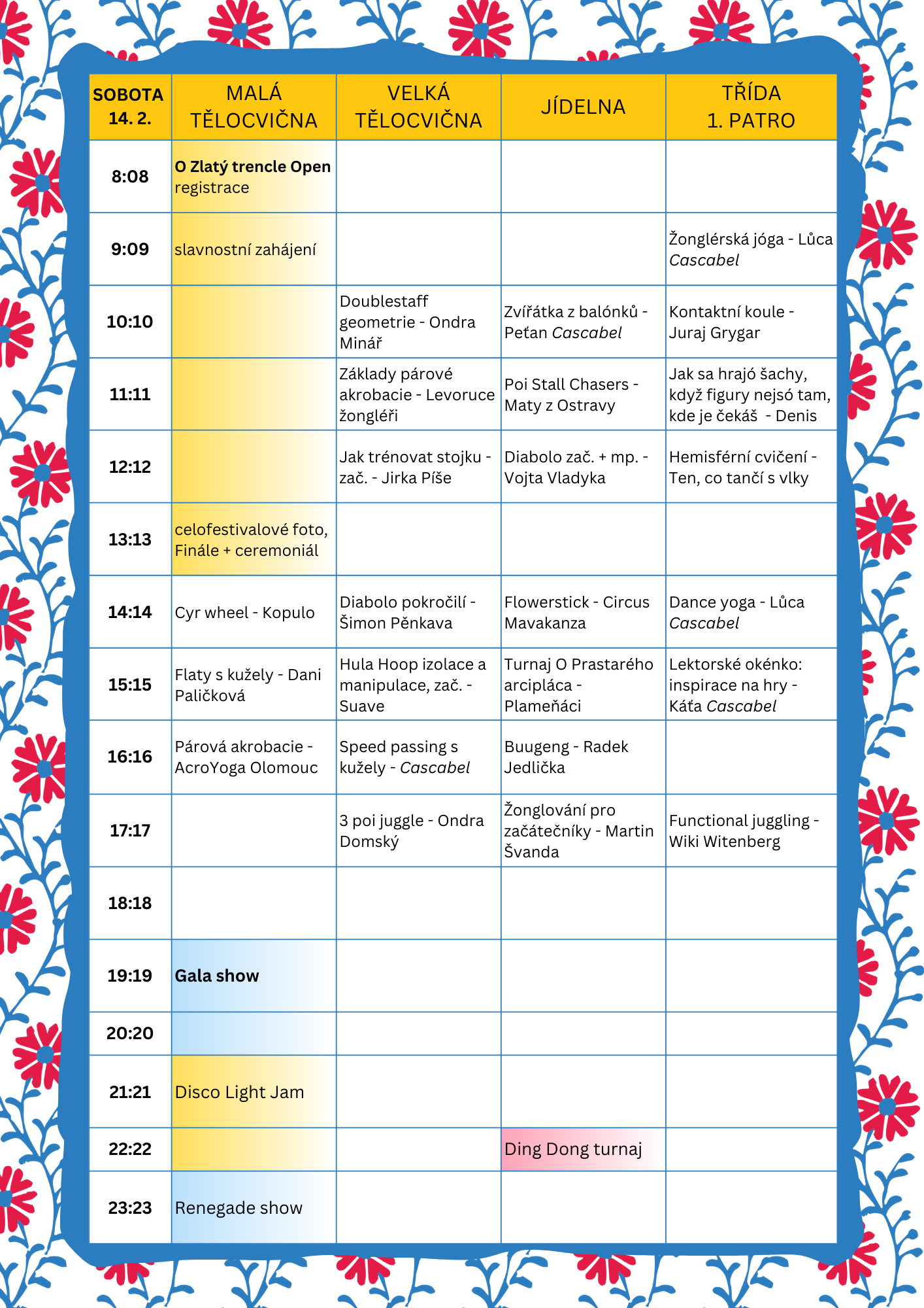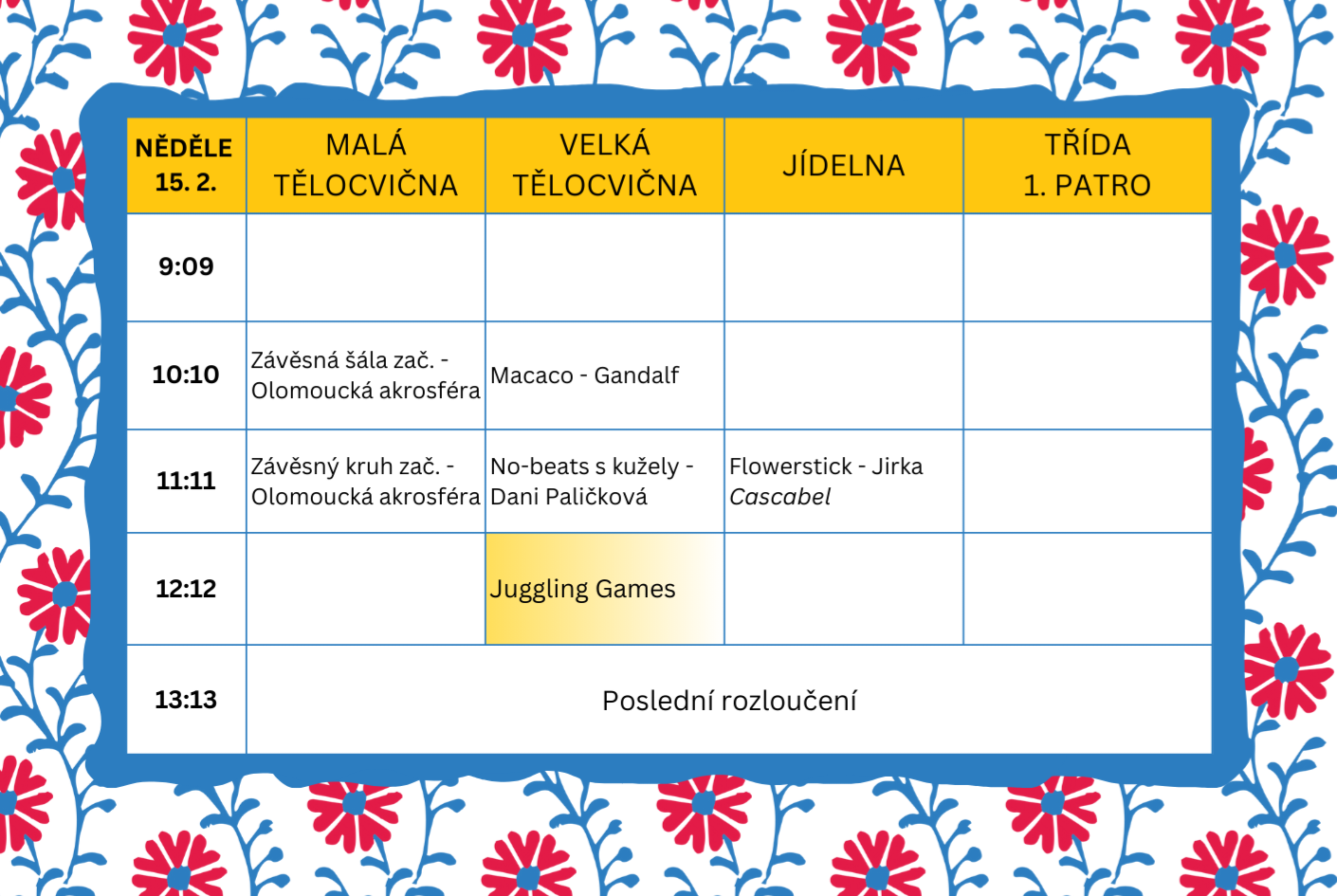 Nedělní dopoledne nabídne Juggling games, čili žonglérské hry! Těšte se na disciplíny, které otestují vaši výdrž, šikovnost i vynalézavost. Zahrajeme si klasiky jako Simon říká, Gladiátor, Coin juggling i nejrůznější endurance. A pozor! Chystáme několik novinek.