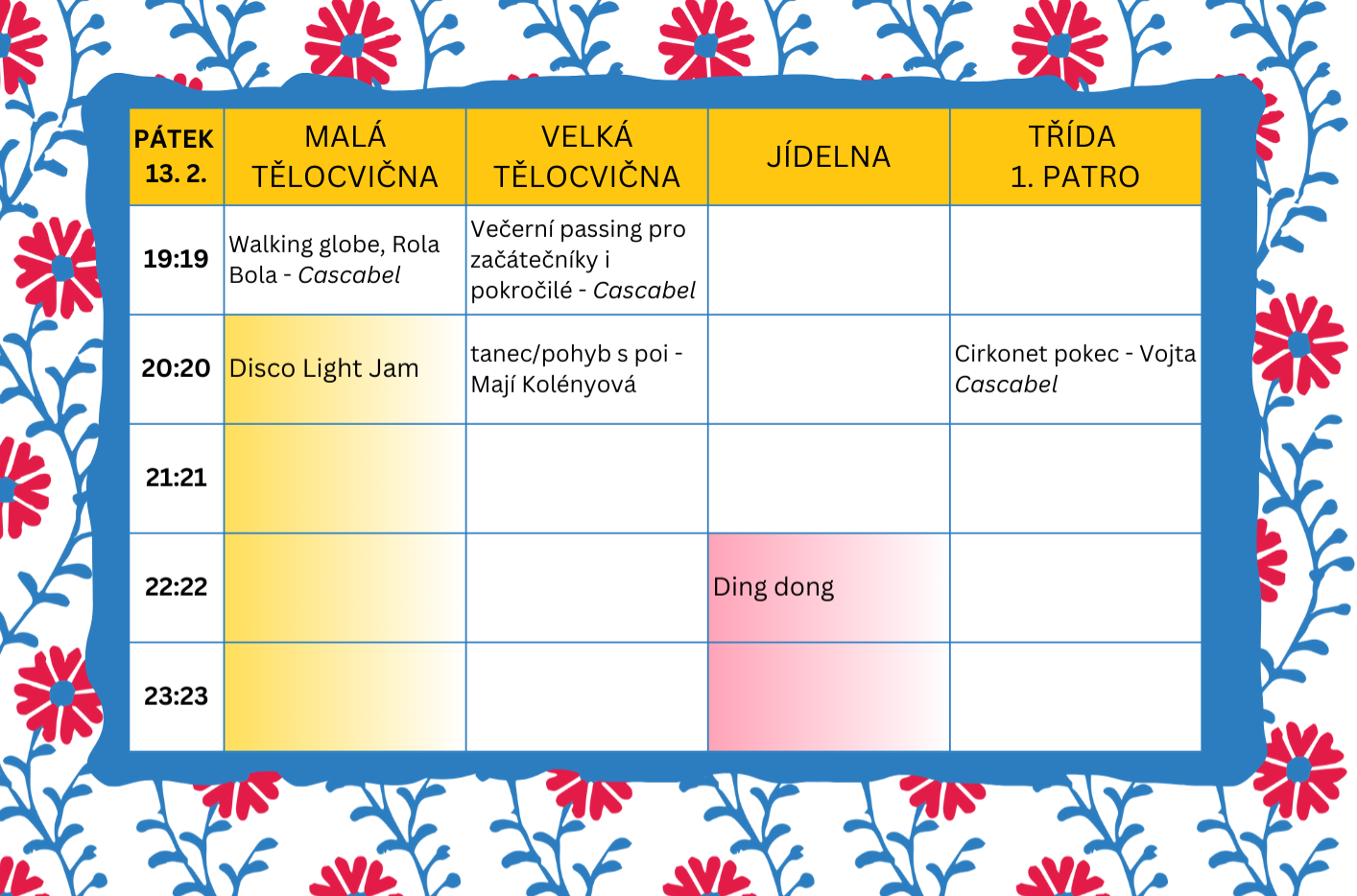 V jedné ze dvou tělocvičen bude v pátek příjemné přítmí a kvalitní hudba - zkrátka ta správná atmosféra pro LED žonglování. A pokud zrovna nemáte chuť žonglovat, klidně se prostor promění v taneční parket! Takže všechny své LED kuželky, poiky, hoopy, tyče i míčky s sebou!